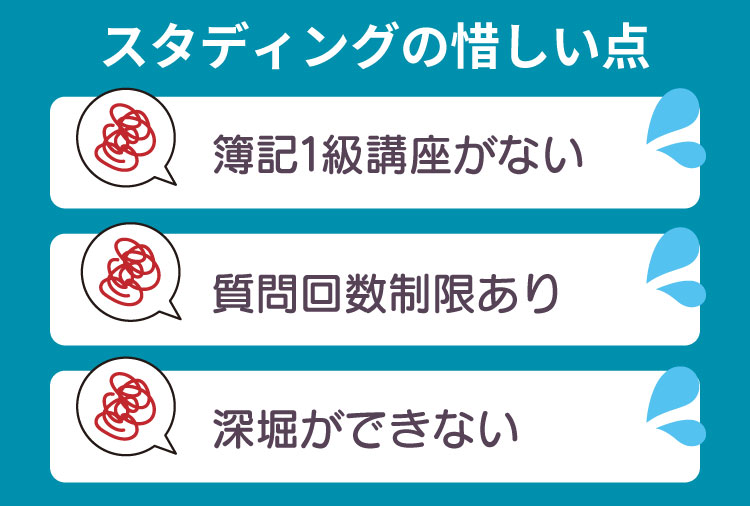 「簿記1級まで同じスクールで勉強したい!」と考えている人は、簿記1級講座まで取り扱っている「スタディング
